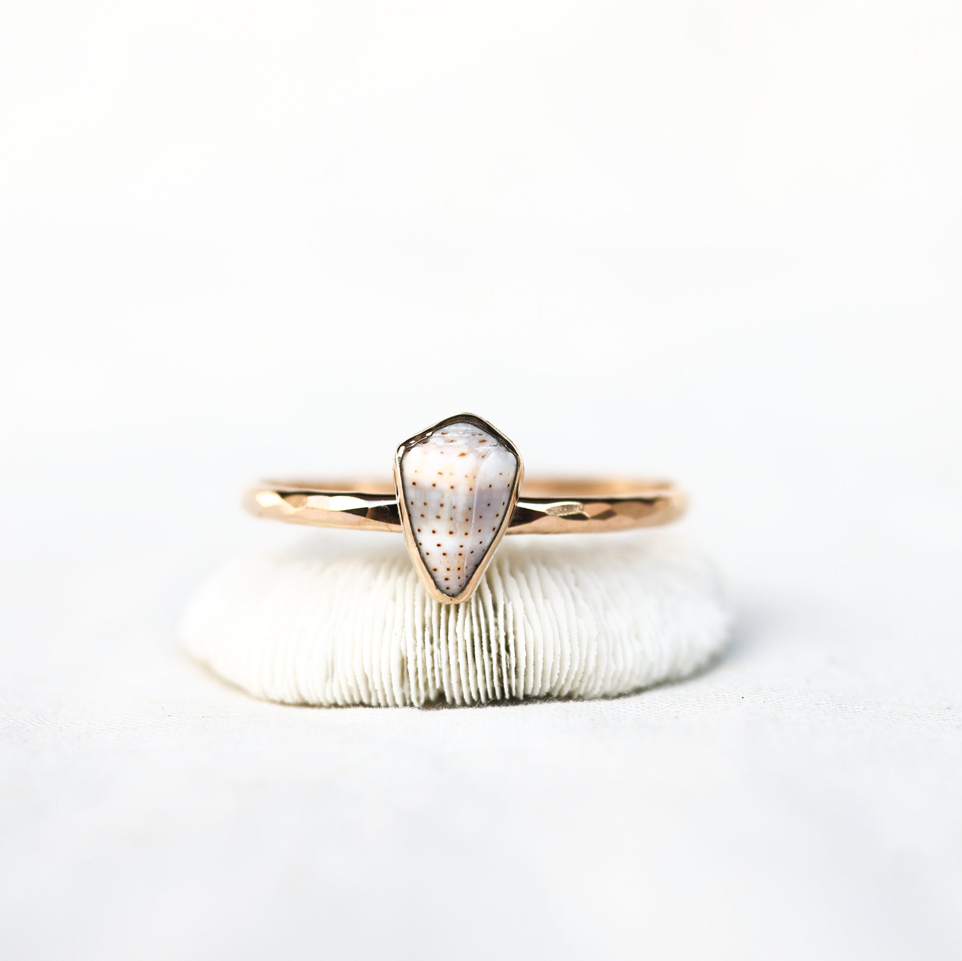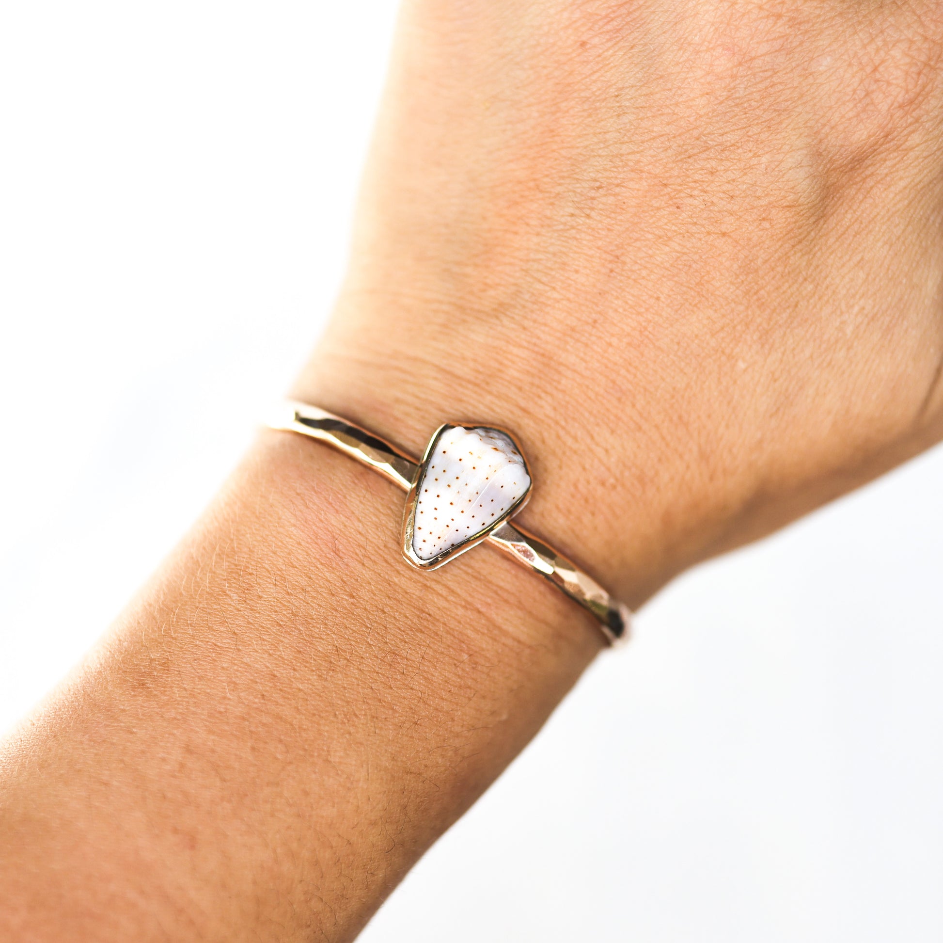 This Hebrew cone shell has been bezel set in 14k gold fill with a .999 fine silver backplate and a 14k gold fill band. The silver backplate is not visible when the bracelet is being worn.