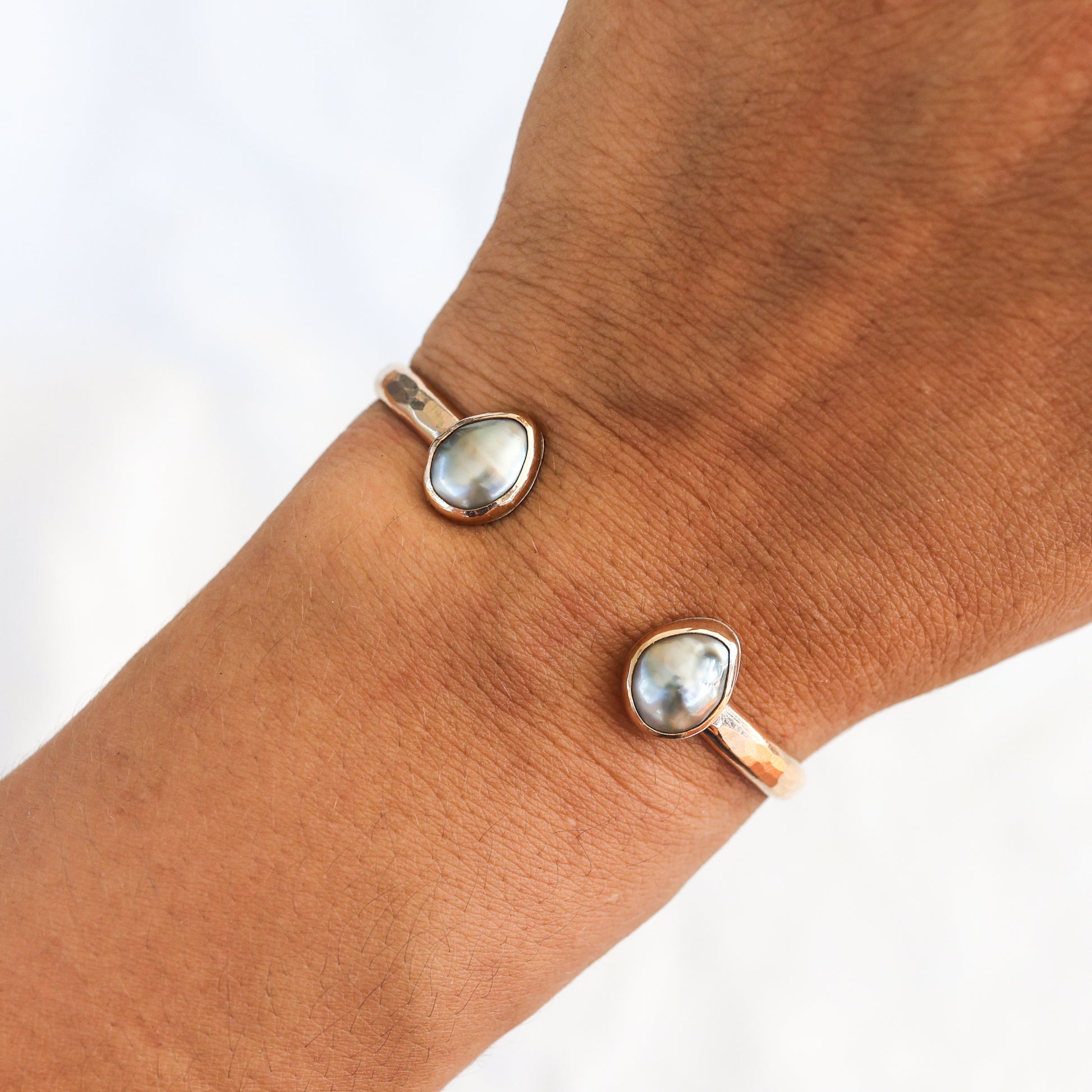 This Tahitian pearl cuff is made from a single pearl that has been sliced in half and set to showcase each unique side. Both halves are set in 14k gold fill with a .999 fine silver back plate which is not visible when worn. The band is 14k gold fill.