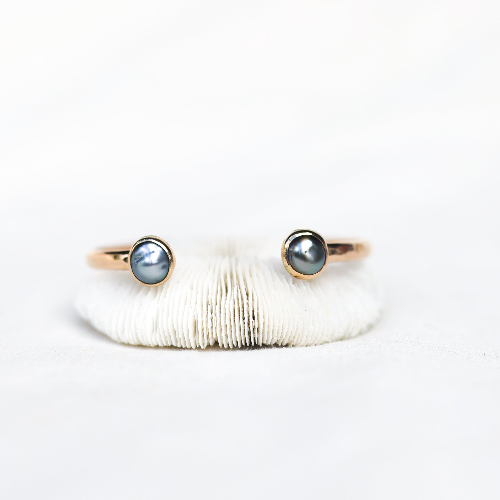This Tahitian pearl cuff is made from a single pearl that has been sliced in half and set to showcase each unique side. Both halves are set in 14k gold fill with a .999 fine silver back plate which is not visible when worn. The band is 14k gold fill.