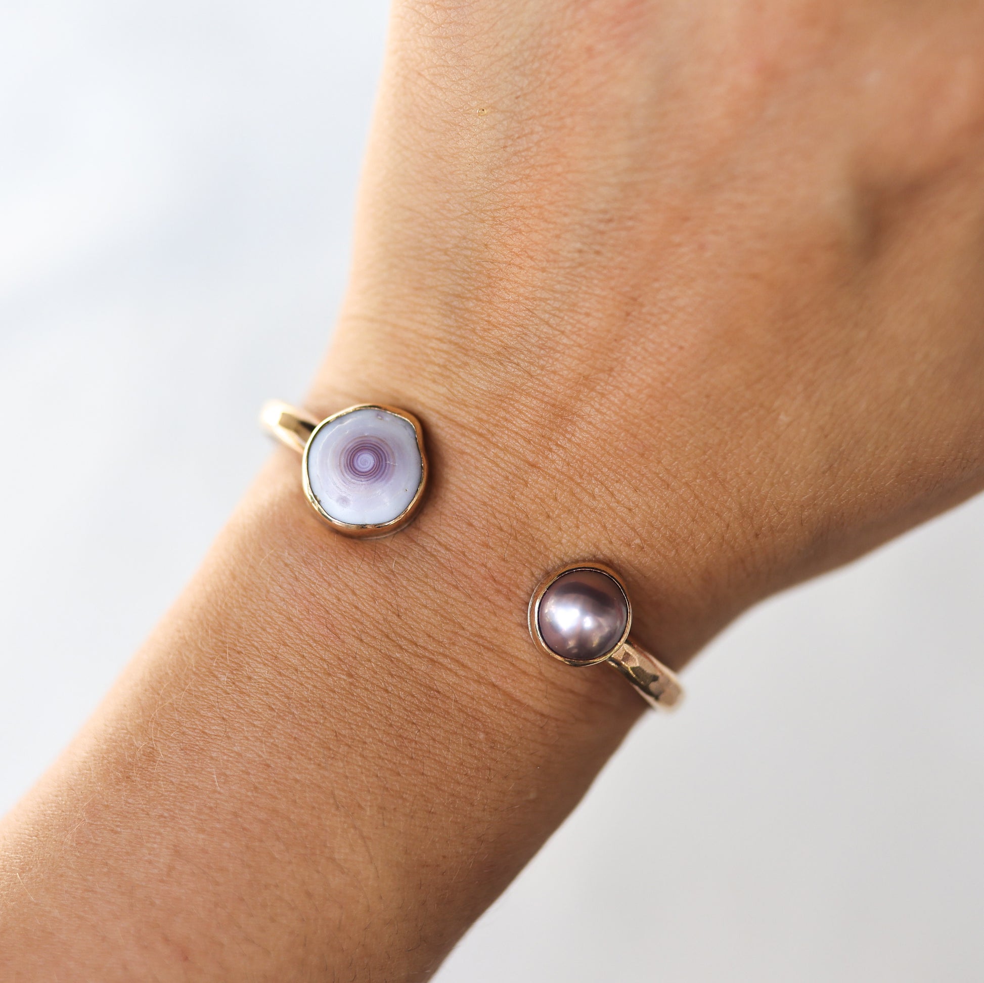 This puka shell has been paired with pink Edison pearl and set in 14k gold fill. The back plate is made of .999 fine silver and the band is made of 14k gold fill. The silver is not visible while the bracelet is being worn.