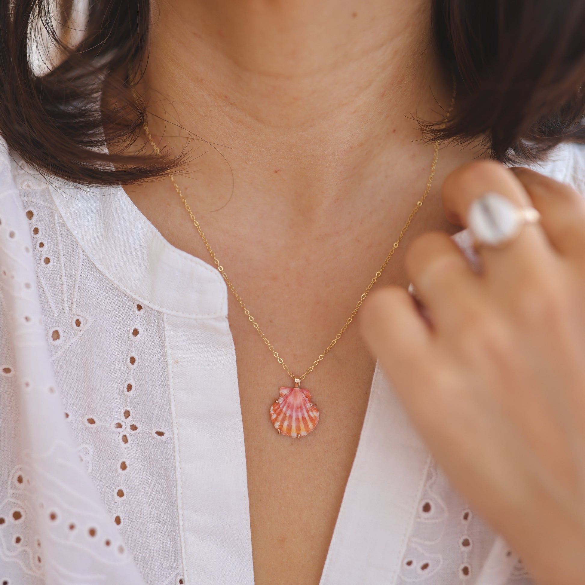 These sunrise shells have each been set in a hand crafted, 14k gold fill, one of a kind prong setting.