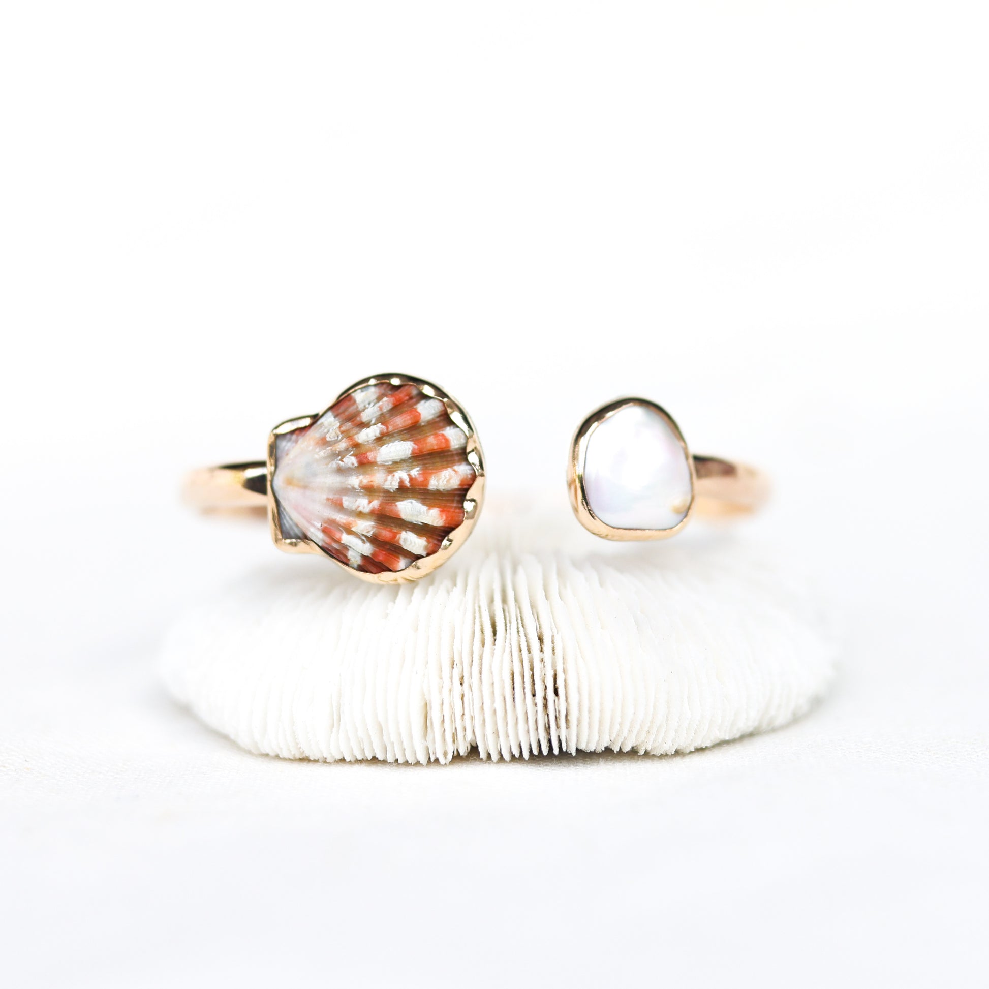 The shell and pearl are set in 14k gold fill with a .999 fine silver back plate which is not visible when worn. The band is 14k gold fill.