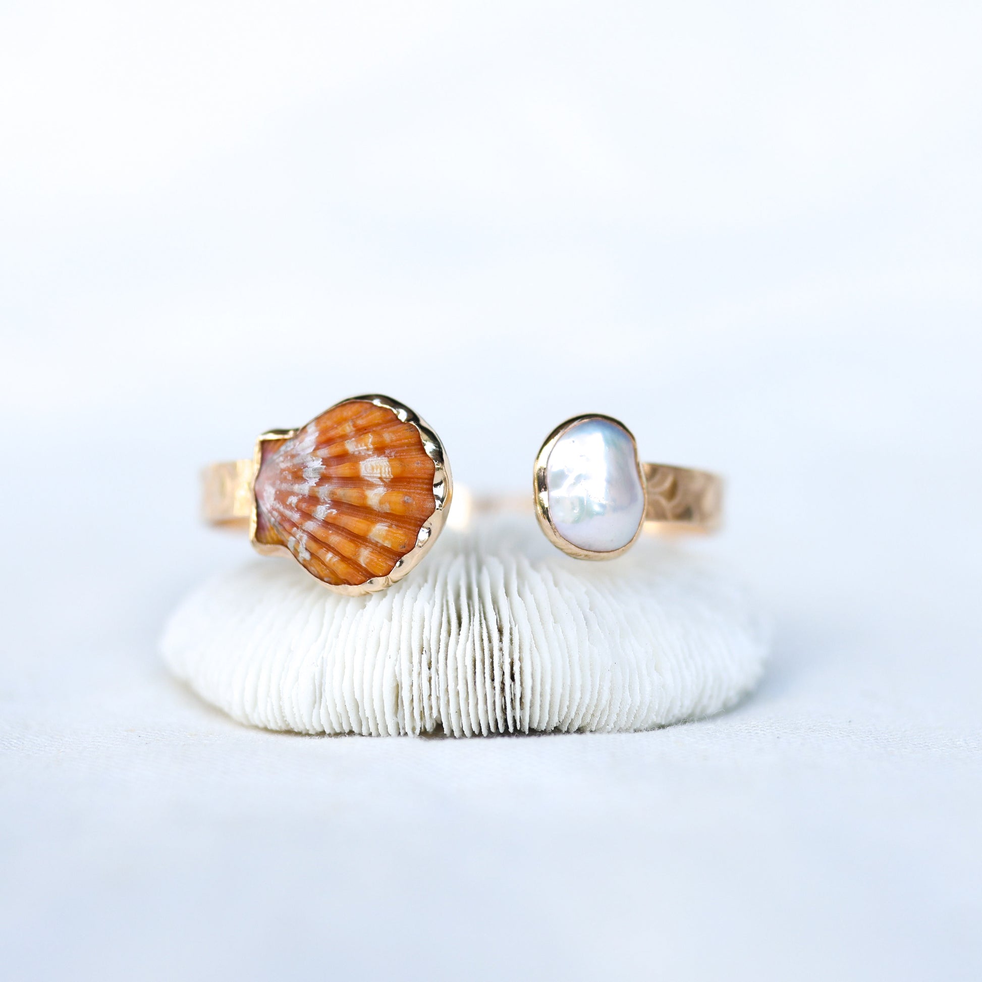 This cuff features a Hawaiian sunrise shell paired with a white Edison Keshi Pearl. The sunrise shell has been bezel set in 14k gold fill. The back plate is made of .999 fine silver which isn’t visible when being worn. The band is 14k gold fill and has been hand stamped with mermaid scales.