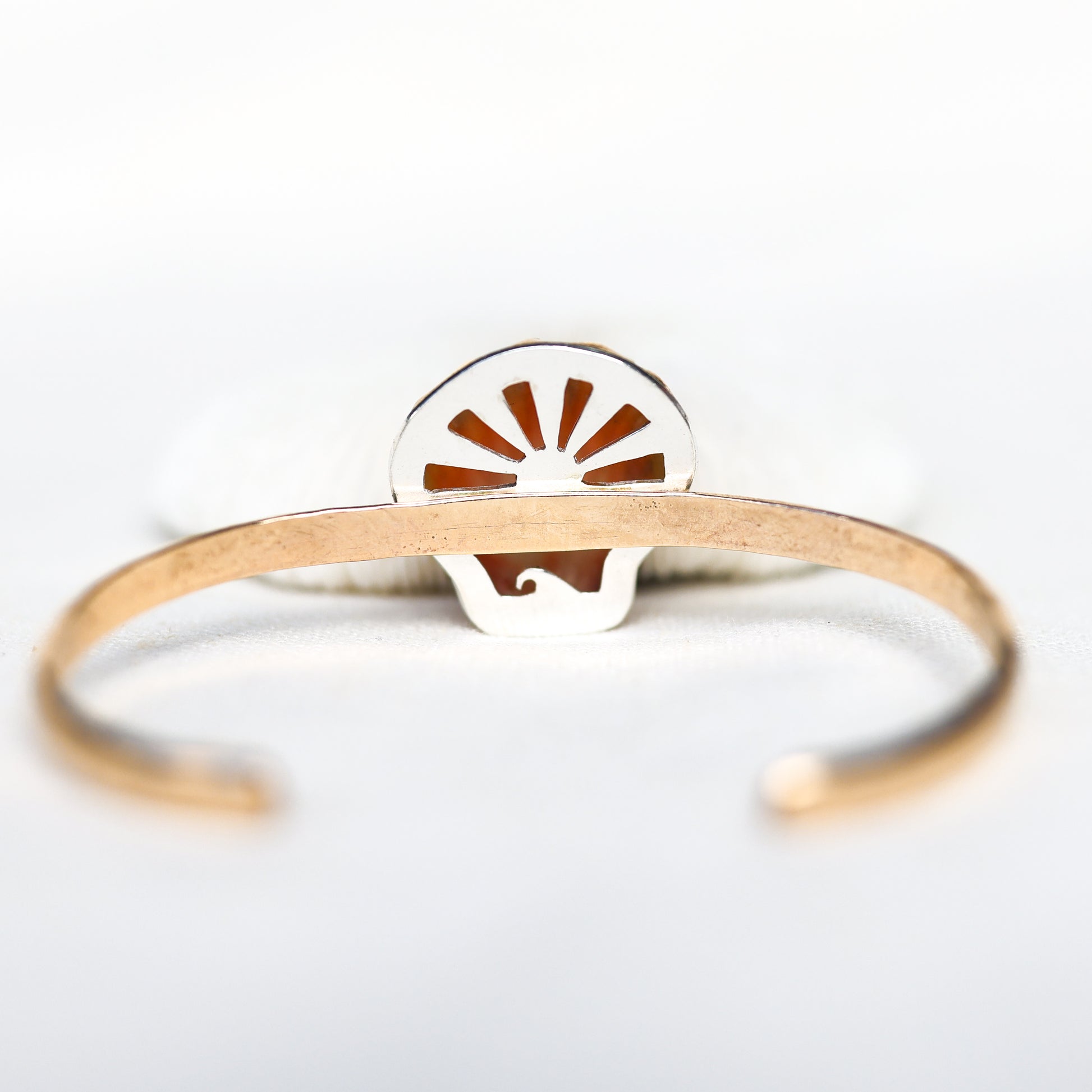This gorgeous cuff is simple but makes a statement. The sunrise shell has been bezel set in 14k gold fill. The back plate is made of .999 fine silver which isn’t visible when being worn. The design on the back has been hand cut.