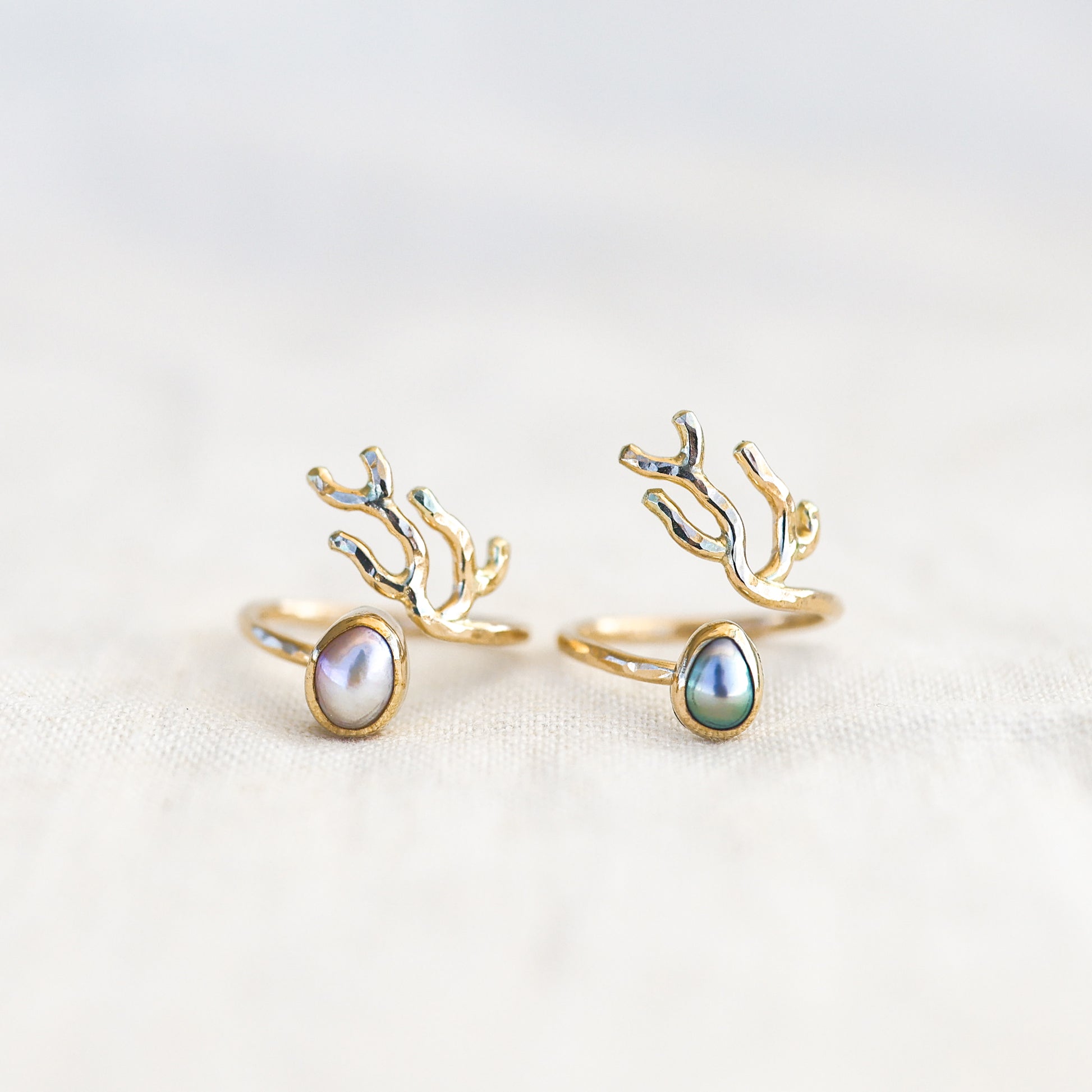 Each ring features a Edison Keshi Pearl with a handcrafted coral branch. The wrap style allows the ring to be adjustable up one ring size and down one ring size. So a size 6 ring may be adjustable from sizes 5-7. Choose the ring size closest to actual size of your ring.